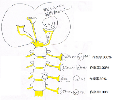 この部分の神経の流れが滞ると、その先の筋肉も通常より力を発揮しにくくなります。「カバーしなきゃ!」と近くの同じ働きをする身体のどこかが余計に働き始めます(≧ヘ≦) ムゥ!