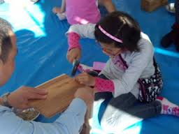 そこでは、子供たちが「大工体験」ができる場があり指導してくれるのは、普段は現場で働いている本物の大工さん達で、しきりに「うまいね~、じょうずだね~」と子供達をほめながら本棚をマン・ツー・マンで一緒に作ってくれます