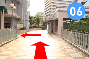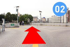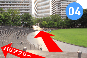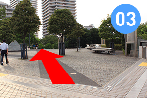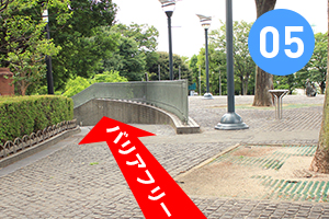 広場に出ましたら、そこをまっすぐに進み広場を横切ります。階段が難しい方は広場の左側にバリアフリー用の坂道もございます。