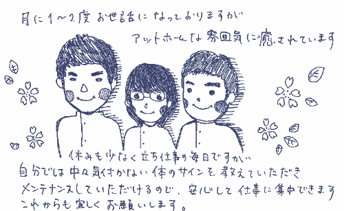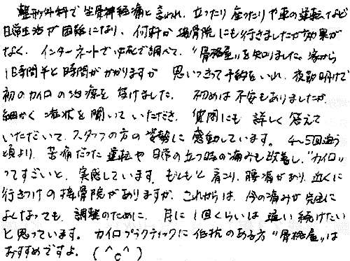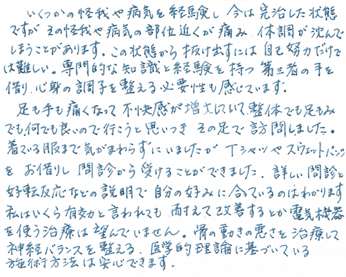 ※症状や状態により施術効果には個人差があります。効果を保障するものではありませんのでご注意ください。また一部適切でない表現もございますが、頂いた感想をそのまま掲載することを優先しております。