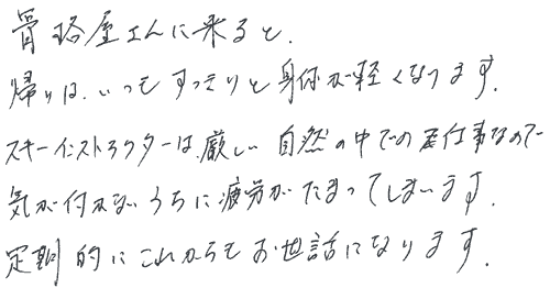 骨格屋さんに来ると、帰りはいつもすっきりと身体が軽くなります。 スキーインスト... 体験談