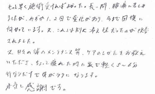 もっと早く施術受ければよかった。長い間、腰痛に苦しみましたが、わずか1,2回で... 体験談