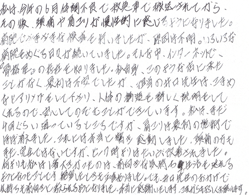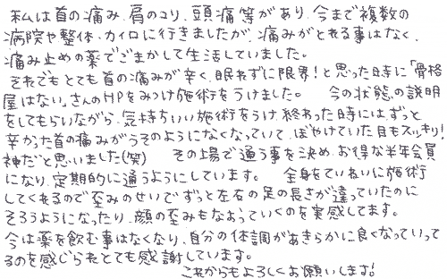 私は首の痛み、肩のコリ、頭痛等があり、今まで複数の病院や整体、カイロに行きま... 体験談