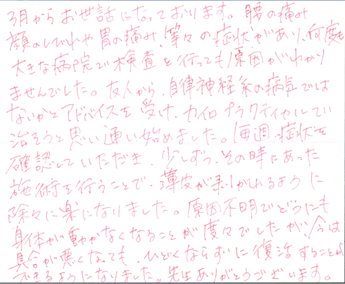 3月からお世話になっております。 腰の痛み 顔のしびれや胃の痛み、等々の症状が... 体験談