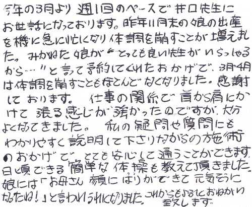 今年の3月より週1回のペースで井口先生にお世話になっております。 昨年11月末の娘... 体験談